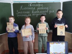 В рамках Недели здорового питания во 2, 4 классах 26 ноября 2025 года проведено мероприятие «Значение витаминов для организма подростка». Цель мероприятия — в доступной форме рассказать ребятам о важности витаминов и сформировать основы здорового питания. В ходе мероприятия школьники узнали: что такое витамины и зачем они нужны; какие бывают витамины (A, B, C, D, E, К) и в каких продуктах содержатся; как недостаток витаминов влияет на организм и может приводить к различным заболеваниям. Ребята послушали краткий рассказ о каждом витамине, его роли в организме и источниках поступления. Игра «Я выбираю». Учащиеся по очереди выбирали карточки с изображениями продуктов и объясняли, какие витамины в них содержатся и чем они полезны. Составление пословицы. Дети вместе собрали известную пословицу о здоровье («Здоровье дороже золота») и обсудили её смысл. Работа с иллюстрациями. Школьники рассмотрели картинки, демонстрирующие признаки авитаминоза, и узнали, каких витаминов не хватает организму при тех или иных симптомах. Ребята заполнили «продуктовую корзину» — выбрали из предложенных изображений самые полезные продукты, богатые витаминами. В завершение мероприятия все учащиеся сфотографировались у доски с иллюстрациями о значении витаминов для организма. Подводя итоги, учащиеся сделали вывод: чтобы быть здоровыми, бодрыми и хорошо учиться, нужно ежедневно употреблять разнообразные продукты, содержащие витамины. Мероприятие прошло оживлённо и познавательно.